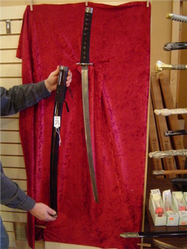 40" Traditional Style Katana. Black Fabric Handle and Laquer Saya (Scabbbord) with red accents, Antiqued pewter Dragon Suba and hardwar, 27" 440 Stainless Katana Blade, ground edge. For Display Use Only.