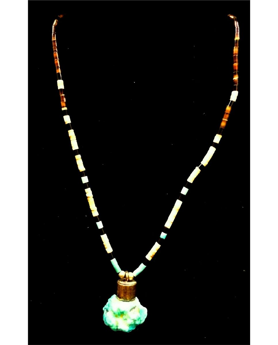A beautiful vintage Native American style necklace with fine heishi beads and a large turquoise cabochon. Fits 14" around the neck.