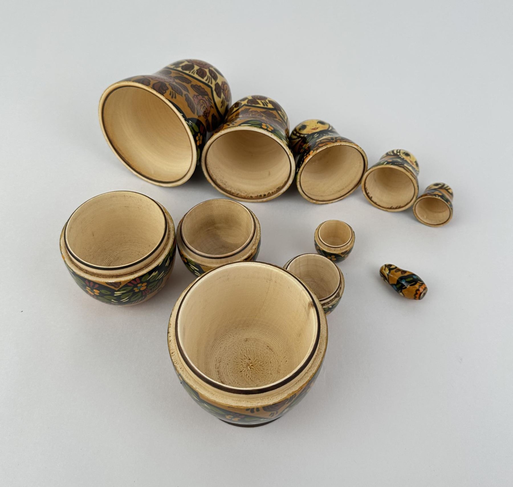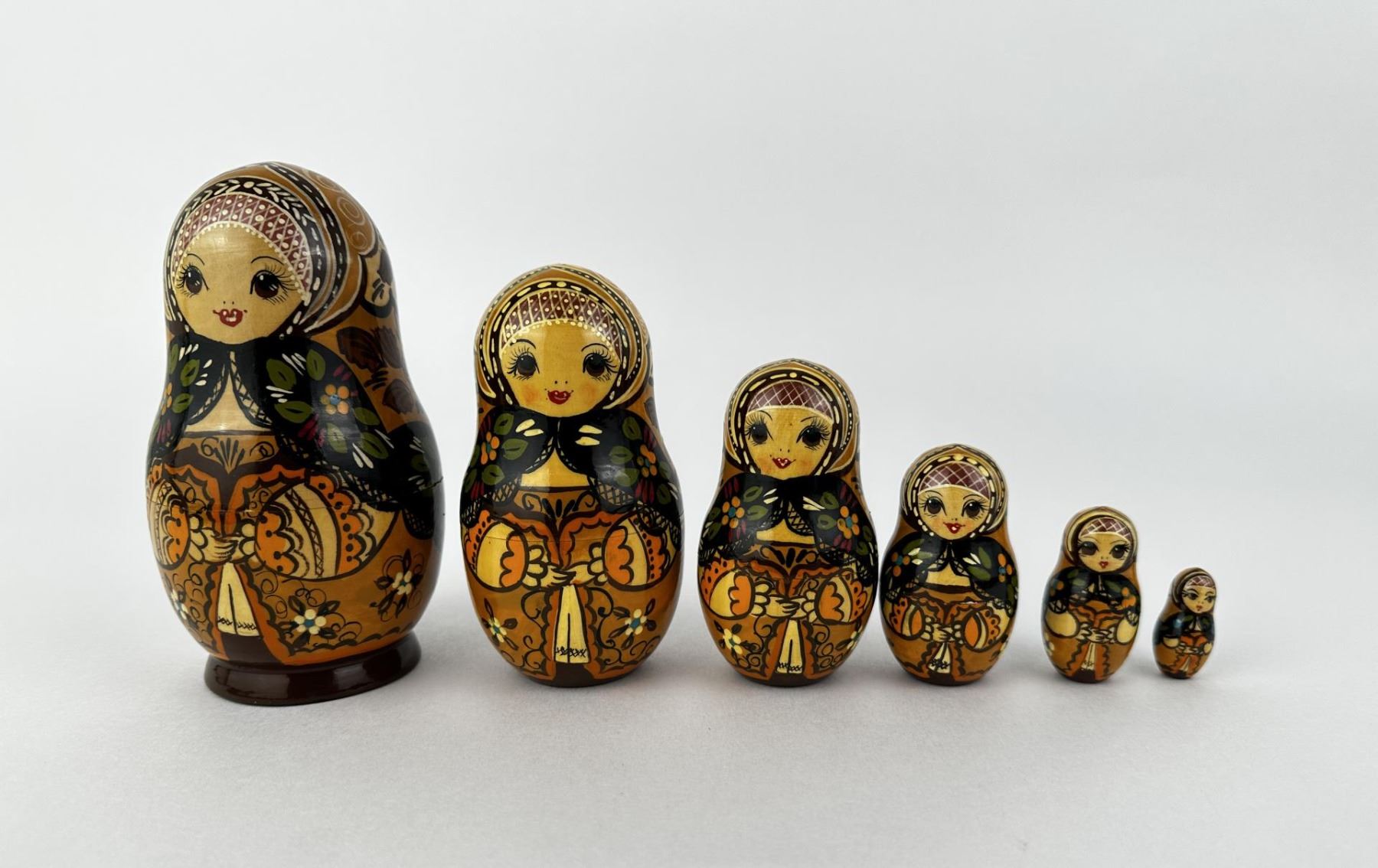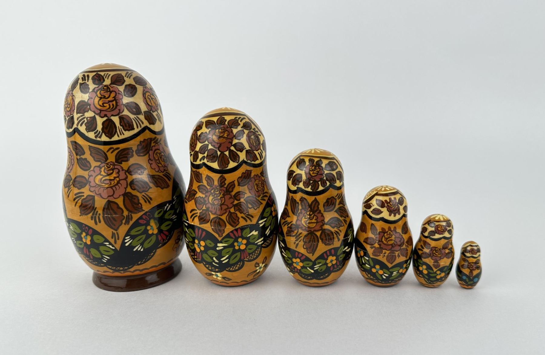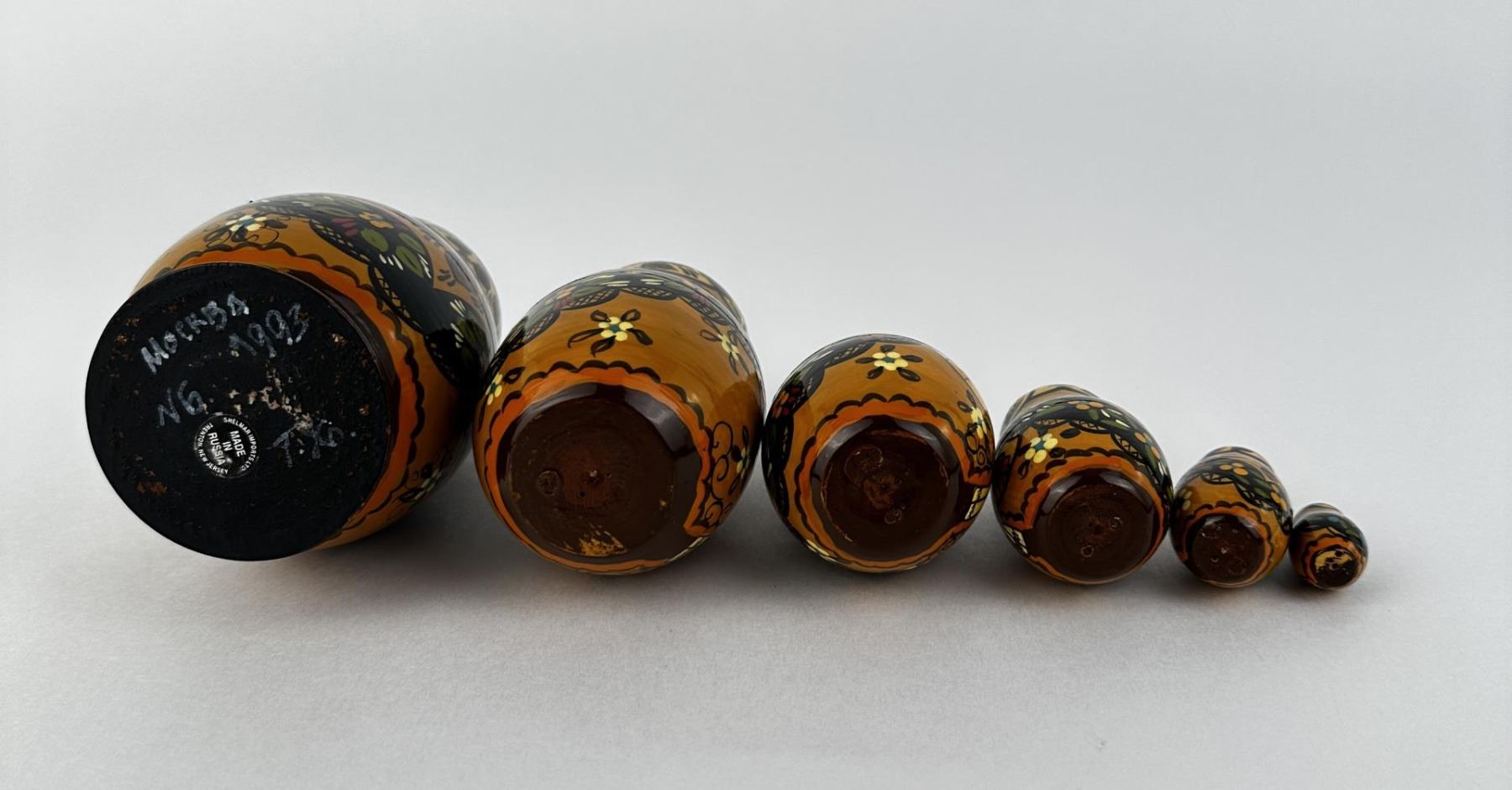 Six nesting pieces. Largest is 5 1/2" tall. Smallest is 1 1/4" tall.