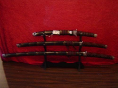 Set of 3 Traditional Samuri Sword Set, 21", 31", 40". Black & Red Handle Wrap, Black Laquer Saya w/ Gold/Pewter Accents, Titanium Finish Metal Trim, 440 Stainless Blades, ground edge. Black Wood Table Stand. For Display Use Only.