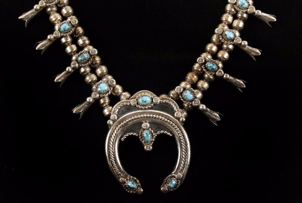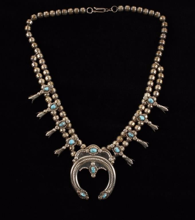 Necklace with traditional stamping. Matching turquoise stones set in the blossoms, and classic naja. This one was made for a lady being approx. 17" long and lighter in weight. It is hallmarked on the back. however, soldering covers the entire hallmark, but an R or K can be seen along with another letter or symbol.