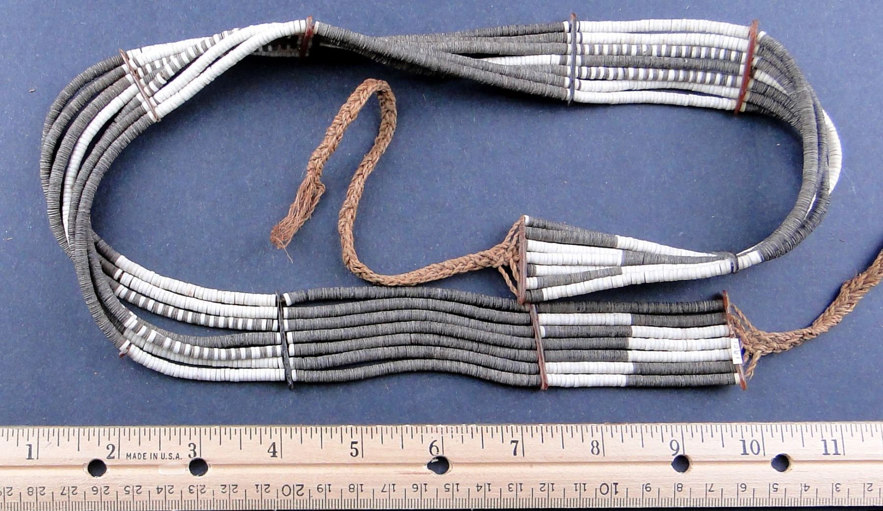 Description: Another kind of traditional money of Yap is figaa, joined multiple strands of grey and white beads worn by women performing dances. This example illustrated in NNP edition, https://nnp.wustl.edu/library/book/541824?page=225, upper right.