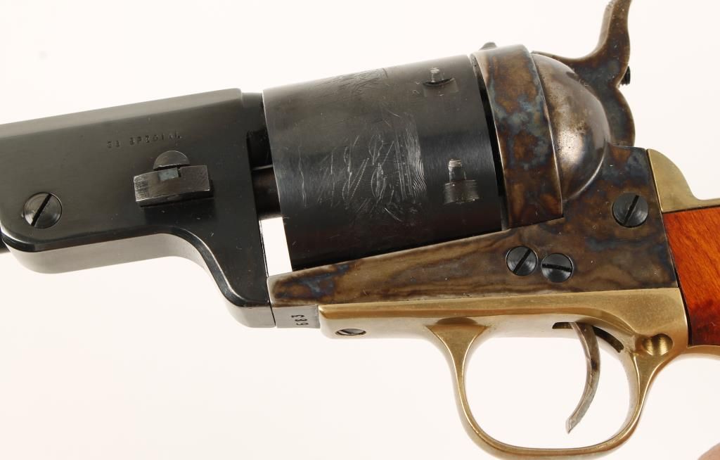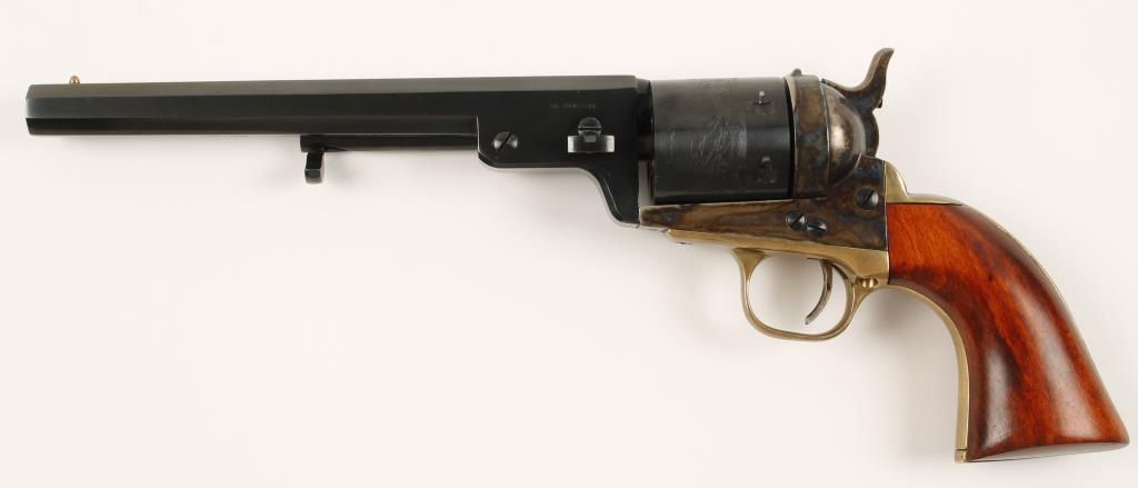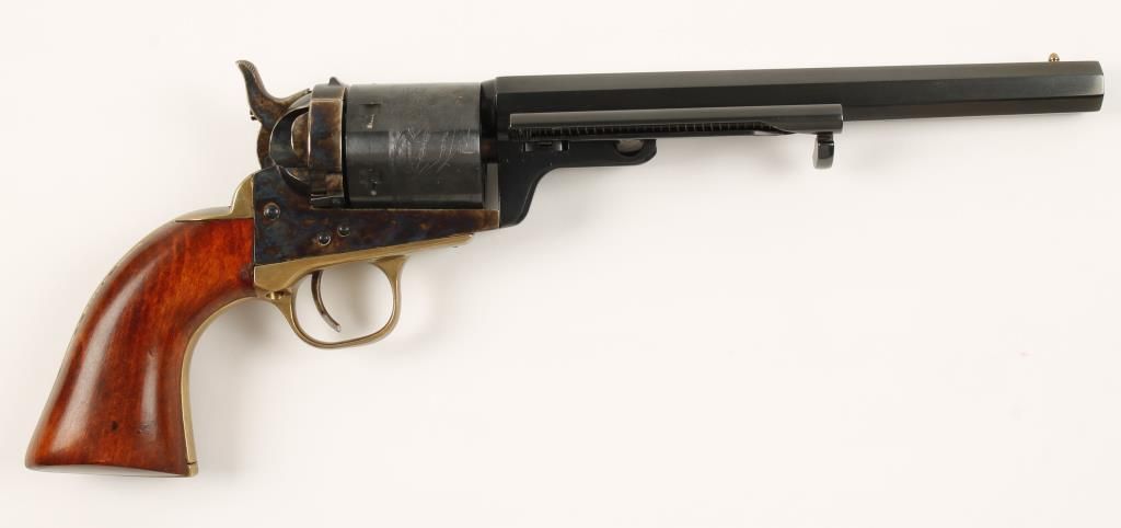 Replica black powder single action 6-shot cartridge conversion pistol. Blued 7-1/2" octagon barrel. No loading lever but there is an ejector rod. Blued and roll-stamped cylinder showing a naval engagement. Case colored frame, hammer and trigger. Brass trigger guard and backstrap. Not cut for a shoulder stock. boxes. Condition is very good. *Antique Firearm*