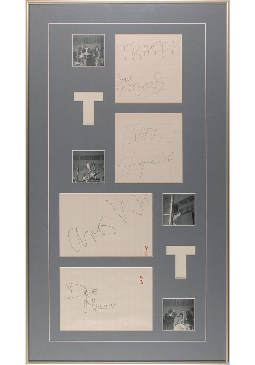 Large ballpoint signatures, “Traffic Steve Winwood,” “Traffic Jim Capaldi,” “Chris Wood,” and “Dave Mason” on individual off-white lined sheets, two dated by the original recipient September 8, 1967. All four are matted and framed together with four second-generation candid photos of the band performing to an overall size of 17.5 x 32. In fine condition. Accompanied by a certificate of authenticity from Tracks. Oversized.