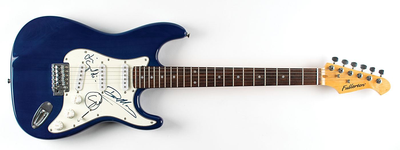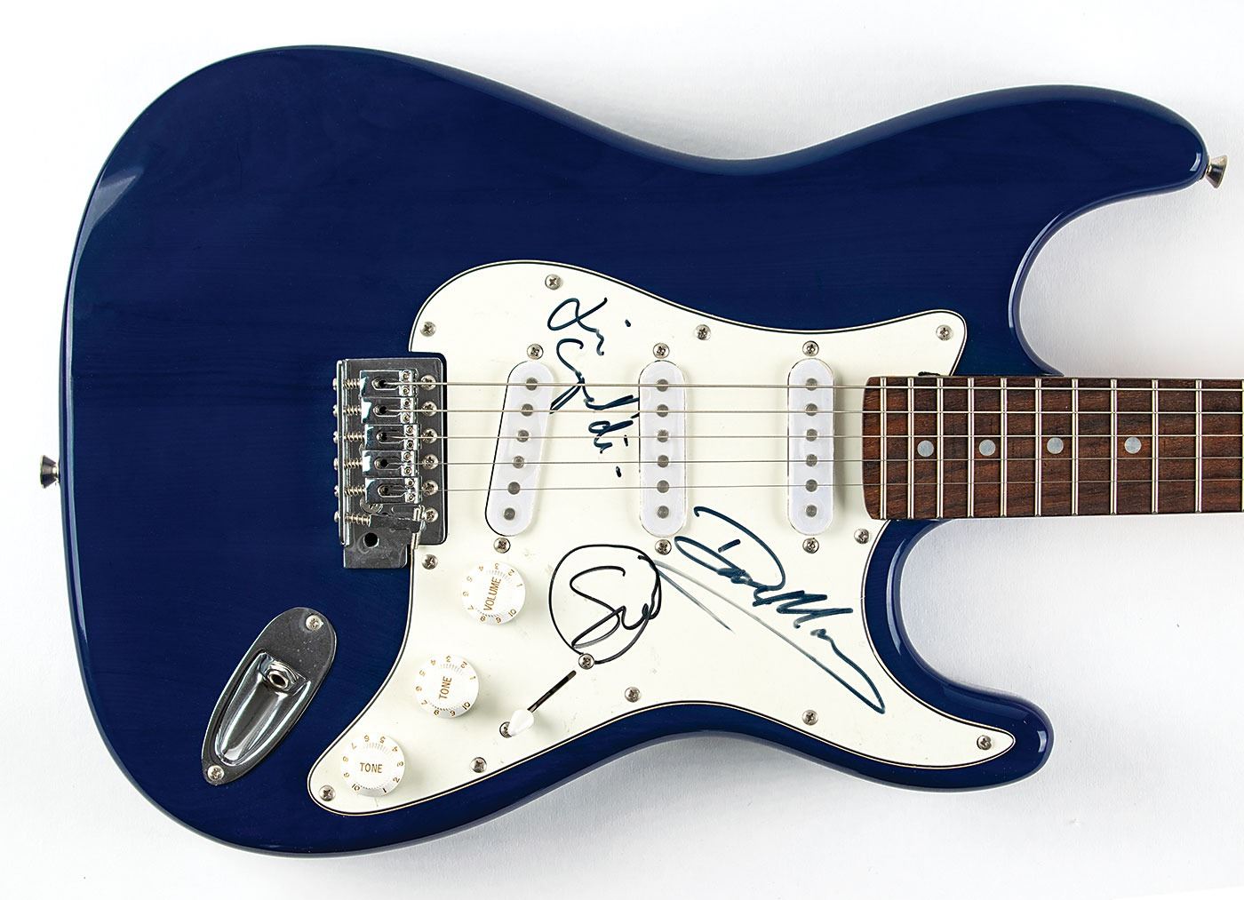 Navy blue Fullerton Stratocaster-style electric guitar, signed on the white pickguard in black felt tip by Steve Winwood, Jim Capaldi, and Dave Mason. In fine condition.