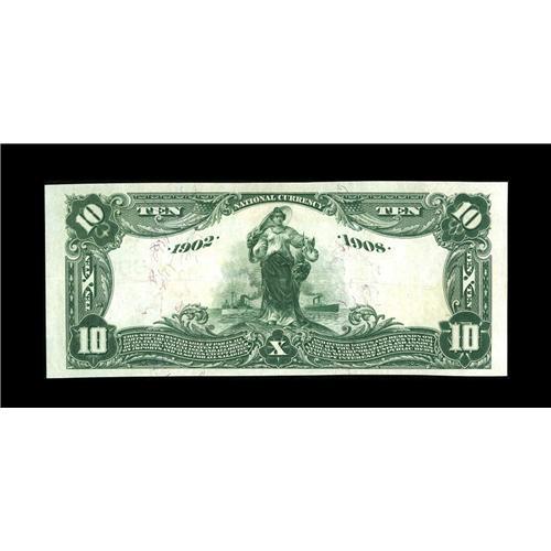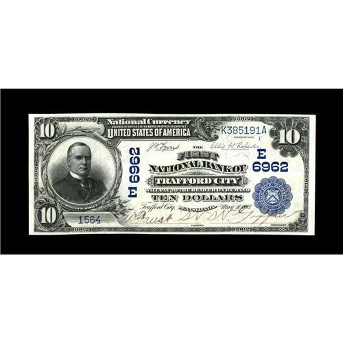 <B>Trafford City, PA</B></I> - $10 1902 Date Back Fr. 616 <B>The First NB</B></I> Ch. # (E)6962<BR>A well centered <B>Extremely Fine-About Uncirculated</B></I> note with the initial appearance of a Gem. Close examination reveals a few subtle circulation indications. We sold this note at our 2002 Central States Numismatic Society auction for $432.50. It remains one of only two $10 Date Backs discovered from this scarce issuer. Given its scarcity and extraordinary eye appeal, we anticipate a realization tonight that will easily surpass that.<BR><BR><b>Shipping:</b> Coin/Currency (<a target="_blank" href="http://www.heritageauctions.com/common/shipping.php">view shipping information</a>)