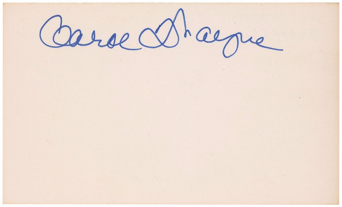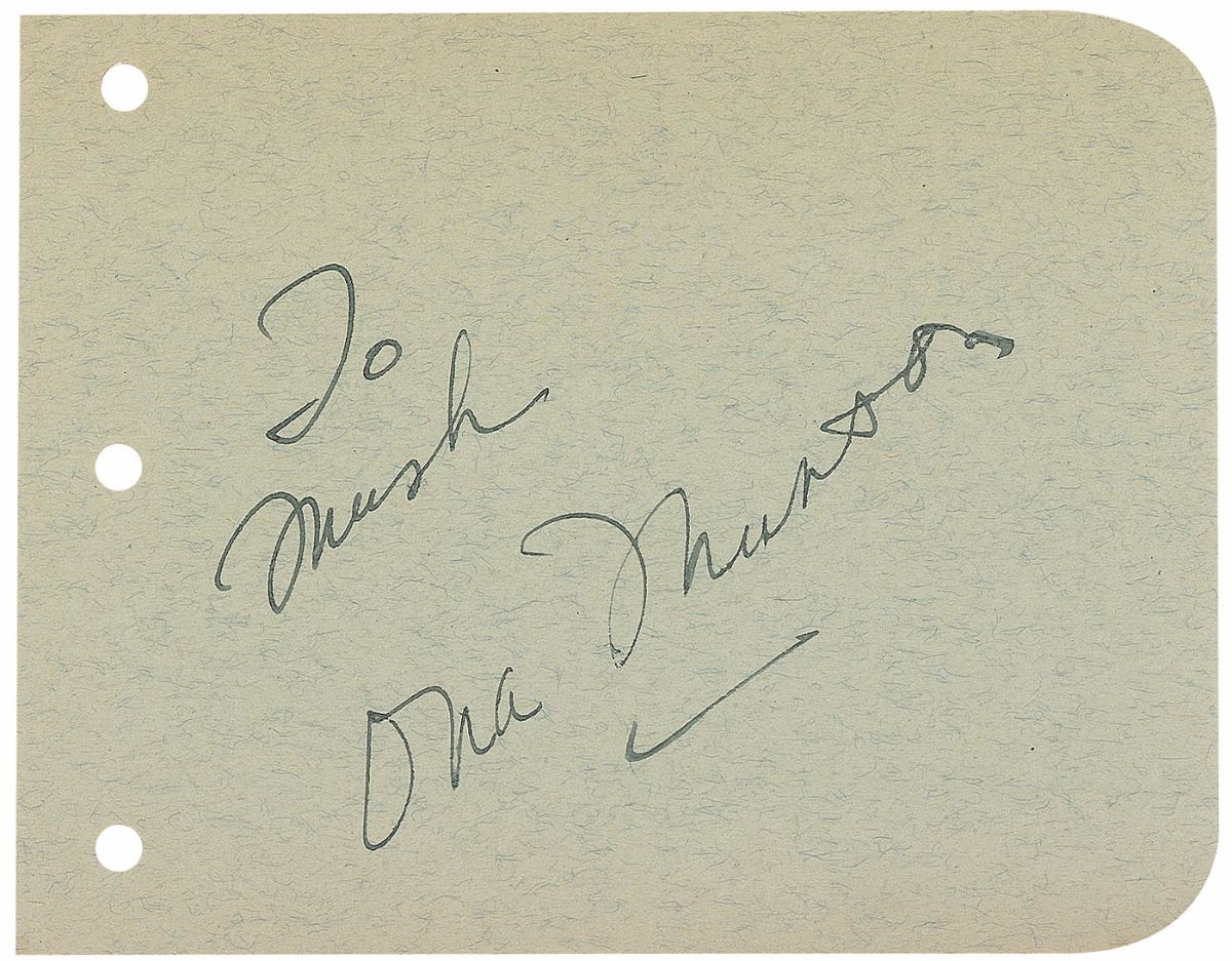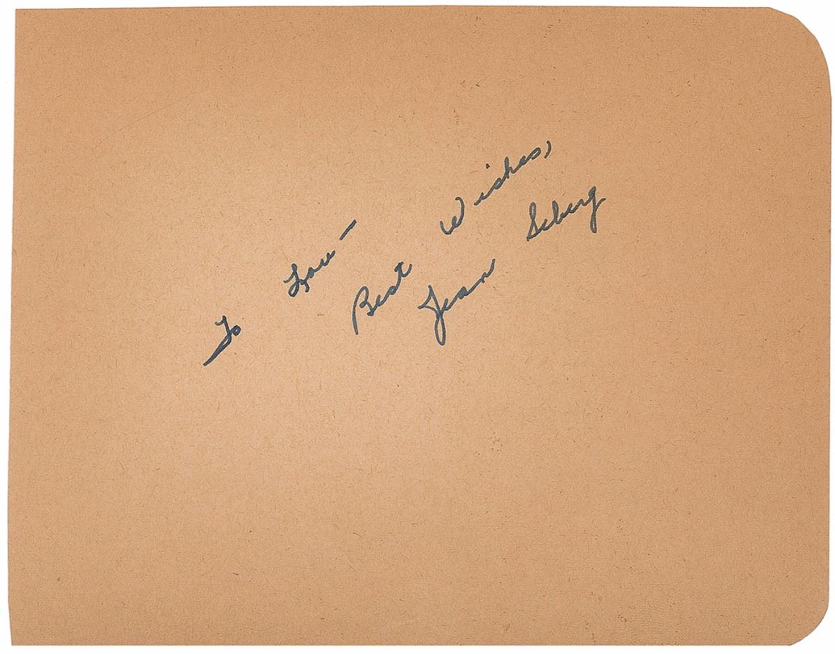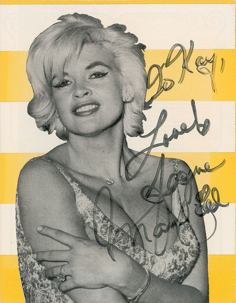 Collection of eight items signed by tragic actresses, including a program signed and inscribed in black felt tip by Jayne Mansfield; and seven ink signatures on various slips, cards, and album pages, including Ona Munson, Jean Seberg, Lupe Velez, Brenda Benet, Savannah (ins), Inger Stevens (ins), and Carol Wayne. In overall very good to fine condition.