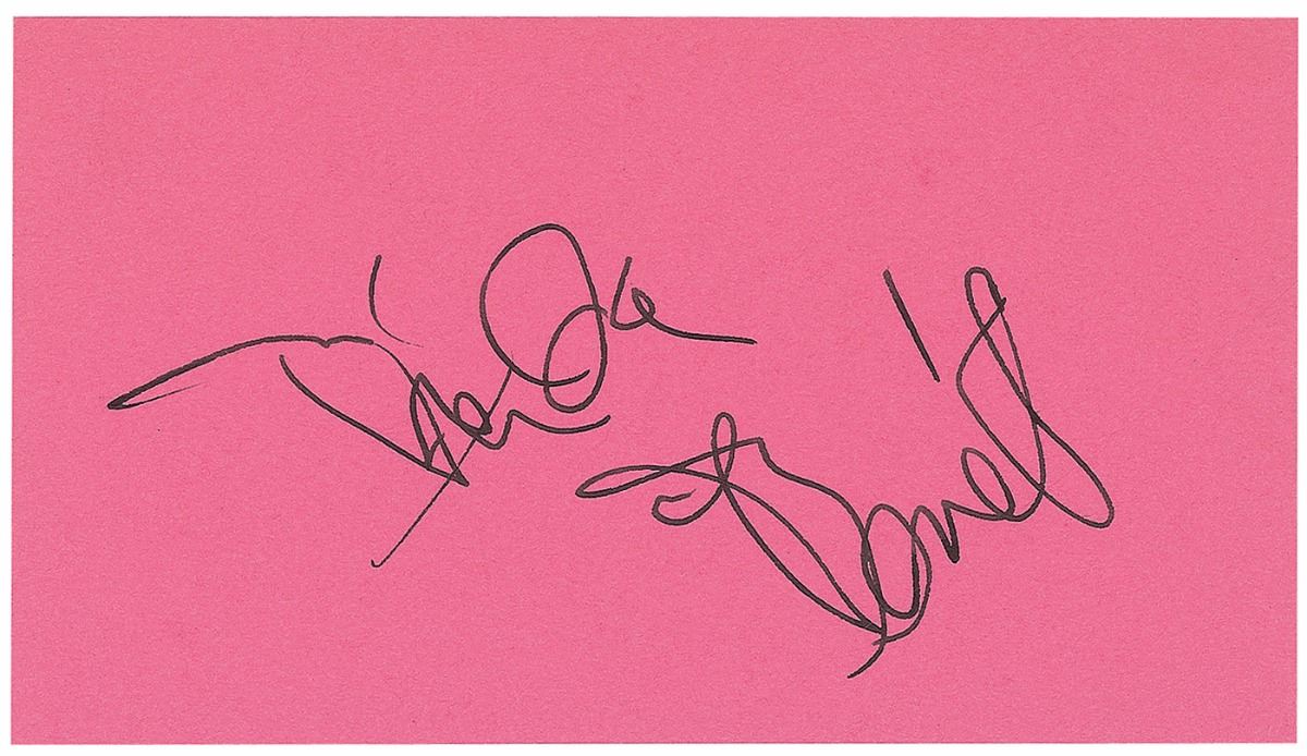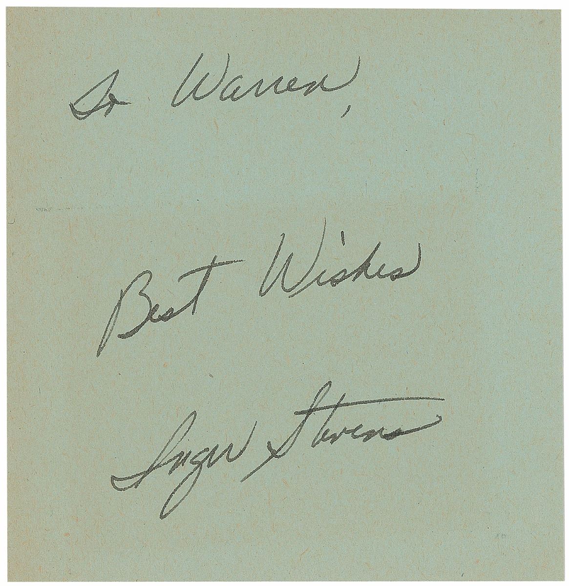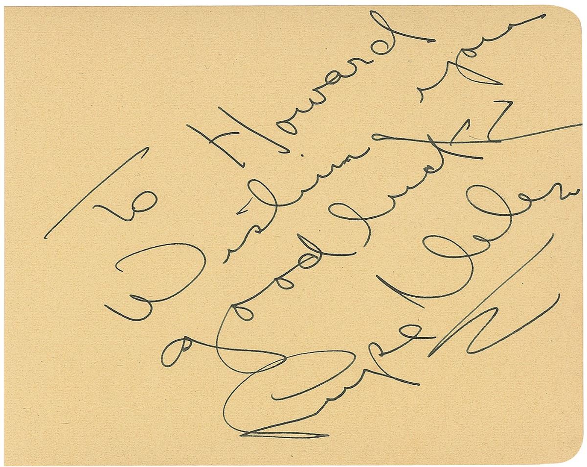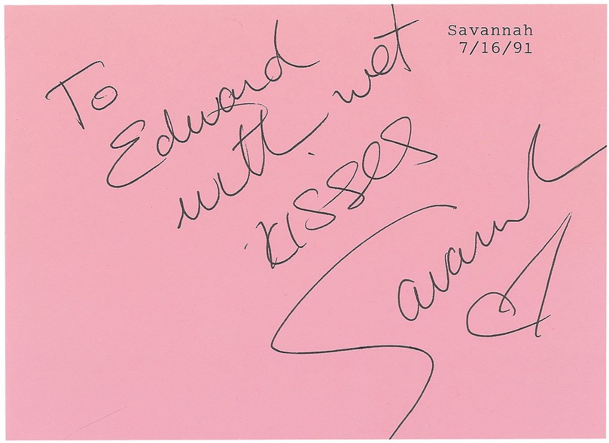 Collection of eight items signed by tragic actresses, including a program signed and inscribed in black felt tip by Jayne Mansfield; and seven ink signatures on various slips, cards, and album pages, including Ona Munson, Jean Seberg, Lupe Velez, Brenda Benet, Savannah (ins), Inger Stevens (ins), and Carol Wayne. In overall very good to fine condition.