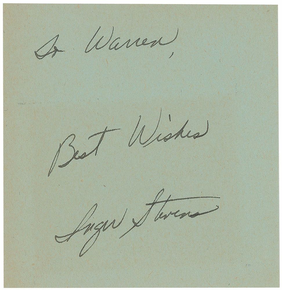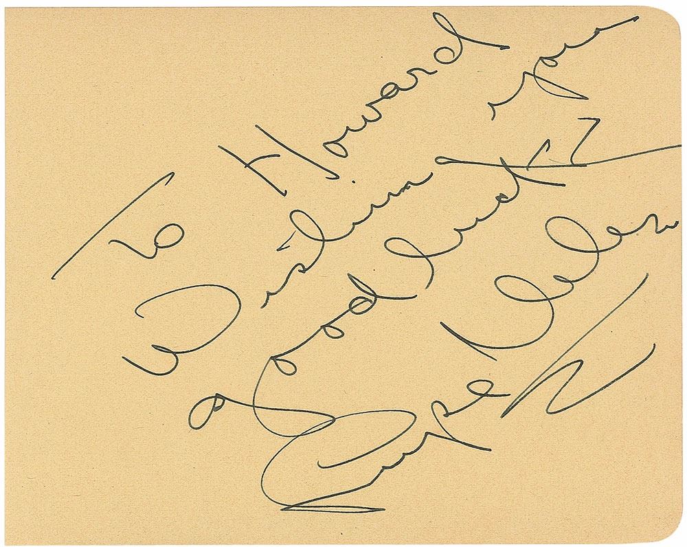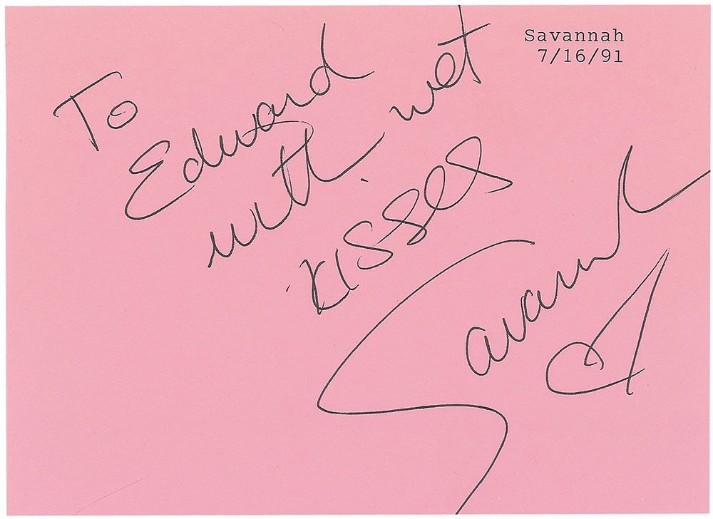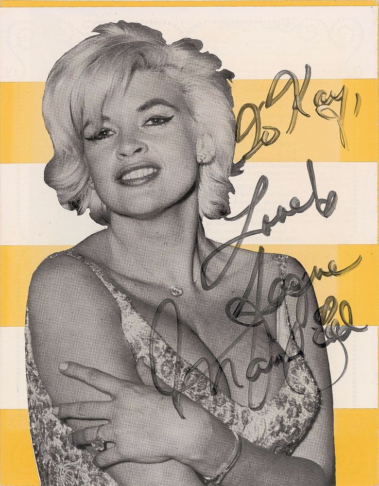 Collection of eight items signed by tragic actresses, including a program signed and inscribed in black felt tip by Jayne Mansfield; and seven ink signatures on various slips, cards, and album pages, including Ona Munson, Jean Seberg, Lupe Velez, Brenda Benet, Savannah (ins), Inger Stevens (ins), and Carol Wayne. In overall very good to fine condition.
