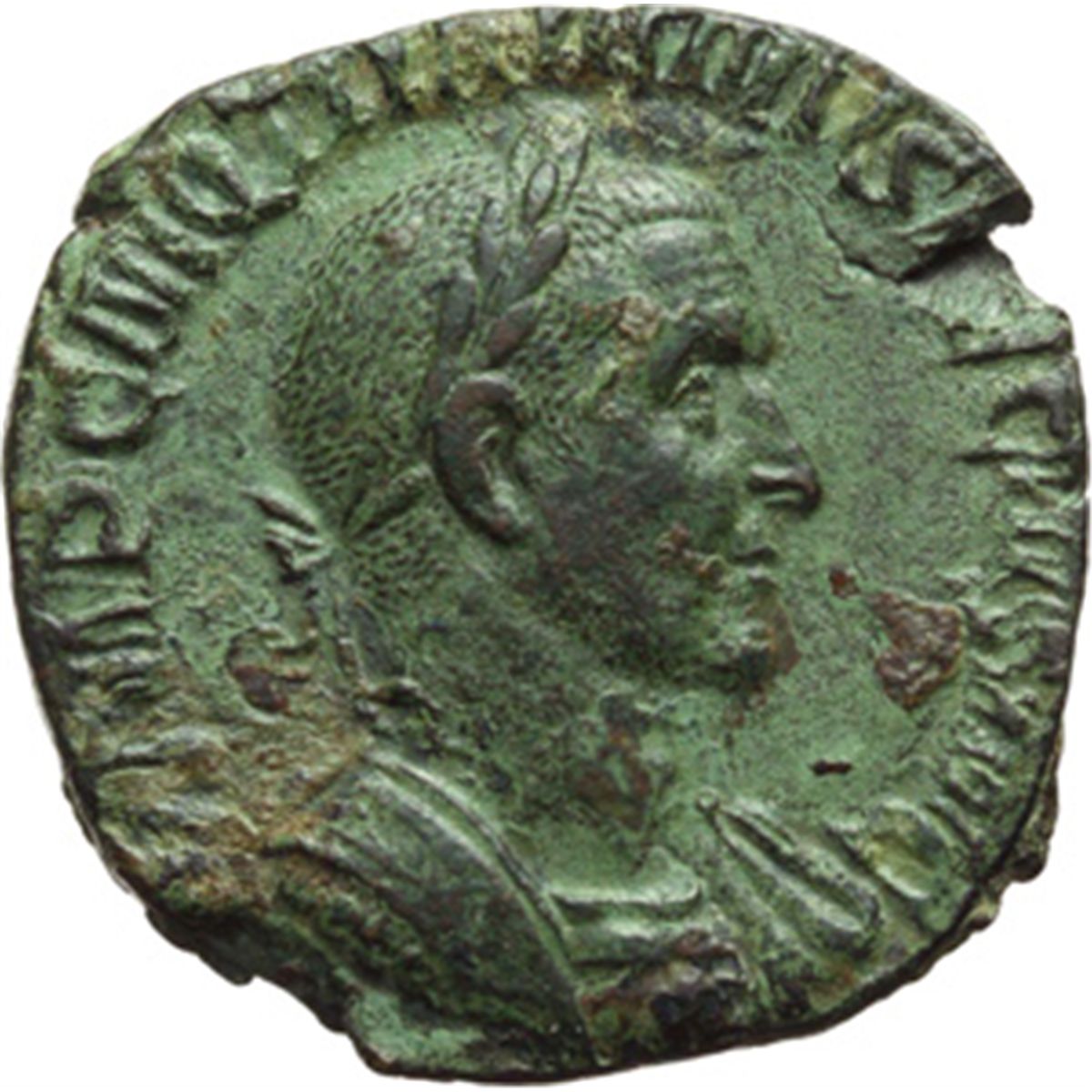 Impero Romano. Traiano Decio (249-251). Sesterzio. D/ IMP C M Q TRAIANVS DECIVS AVG. Busto laureato e corazzato a destra. R/ GENIVS EXERCITVS ILLVRICIANI. Genio stante a sinistra tiene patera e cornucopia. A destra, stendardo. RIC 119. AE. g. 12.91 mm. 29.00 Raro. Patina verde. Bel BB+. Un ritratto di grande stile.