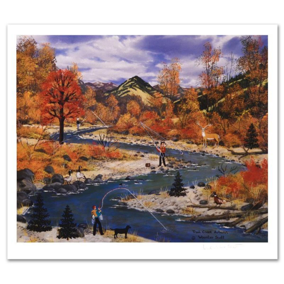 Cozy, down-home images of a bygone era when life was simpler - this is the feeling captured in the creations of one of the world's most recognized artists. "Trail Creek Autumn" is a limited edition lithograph on paper, numbered and hand signed by Wooster Scott! Includes Certificate of Authenticity! Measures approx. 15" x 13.5" (with border), 14" x 11.5" (image). Reference #: 187058.