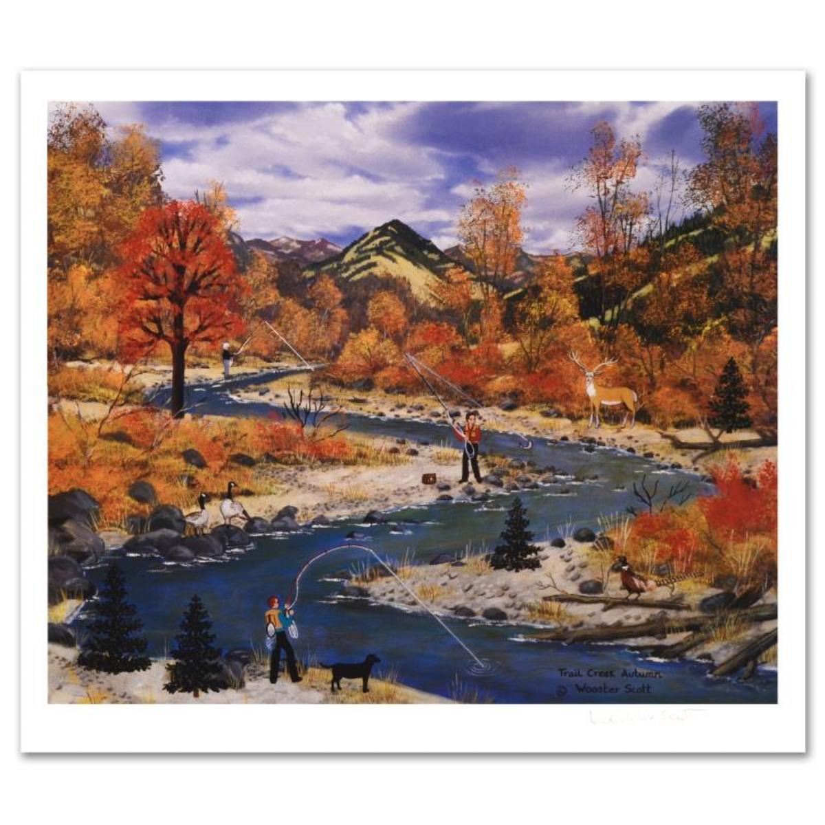 Cozy, down-home images of a bygone era when life was simpler - this is the feeling captured in the creations of one of the world's most recognized artists. "Trail Creek Autumn" is a limited edition lithograph on paper, numbered and hand signed by Wooster Scott. Includes letter of authenticity. Measures approx. 15" x 13.5" (with border), 14" x 11.5" (image).
