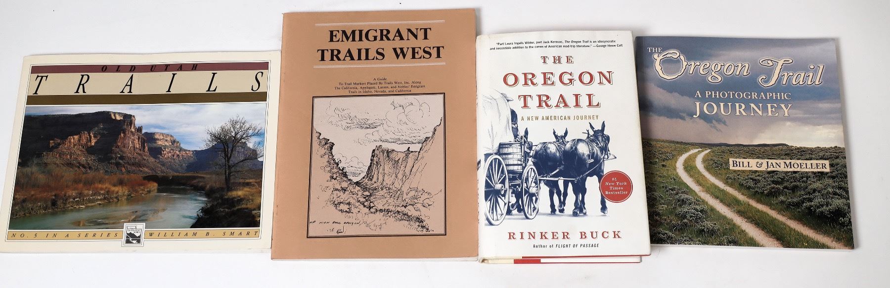 4 trails of the West books. Old Utah Trails by Smart. The Oregon Trail, A New American Journey by Buck. The Oregon Trail, A Photographic Journey by Moeller. Emigrant Trails West by Helfrich._x000D_