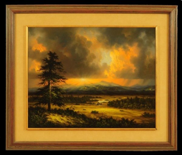 Painting measures 28 1/2" wide x 22-3/4" tall. Frame measures 38" wide and 31 3/4" tall
