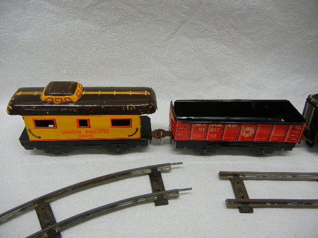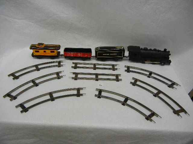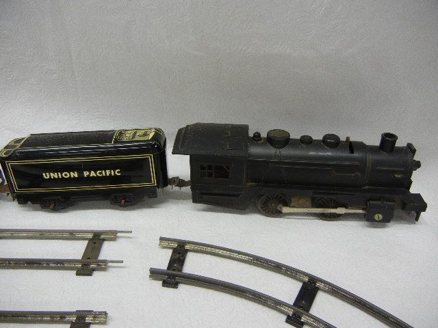 Train Engine, 3 Metal Train Cars, and Train Tracks
