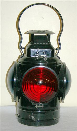 Train Lantern measures approximately 14" high. One red and two blue lights. The Adlake Nonsweating Lamp Chicago. Repainted with some paint chips.