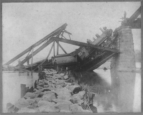 Train Wreck. Large sepia photo c. 1890-1900 of train in river, bridge collapsed. Engine and one car marked "Southern" still dangling from the bridge. 8 x 9 1/2on tan board 10 x 12. Fine.