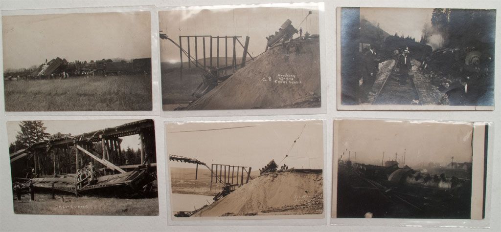Lot of 6: 1) Shows Engine being pulled up a hill, and what's left of a Trestle, card says, Wrecking, April 13, 1912, Chews camp 2. 2) Shows two Steam Engines nose to nose, and a pile of smashed box cars. 3) Shows, passenger cars, and a flat car, after tumbling off a trestle, card says, Rainer wreck. 4) Shows an engine being hoisted up a hill by a crane, and what's left of a trestle, card says The wreck of April 12, 1912, Chews camp # 2. 5) Shows, Engine derailed, and train cars wrecked in a pile. 6) Card shows , Engine and Passenger cars laying on, and across tracks, men walking down tracks.