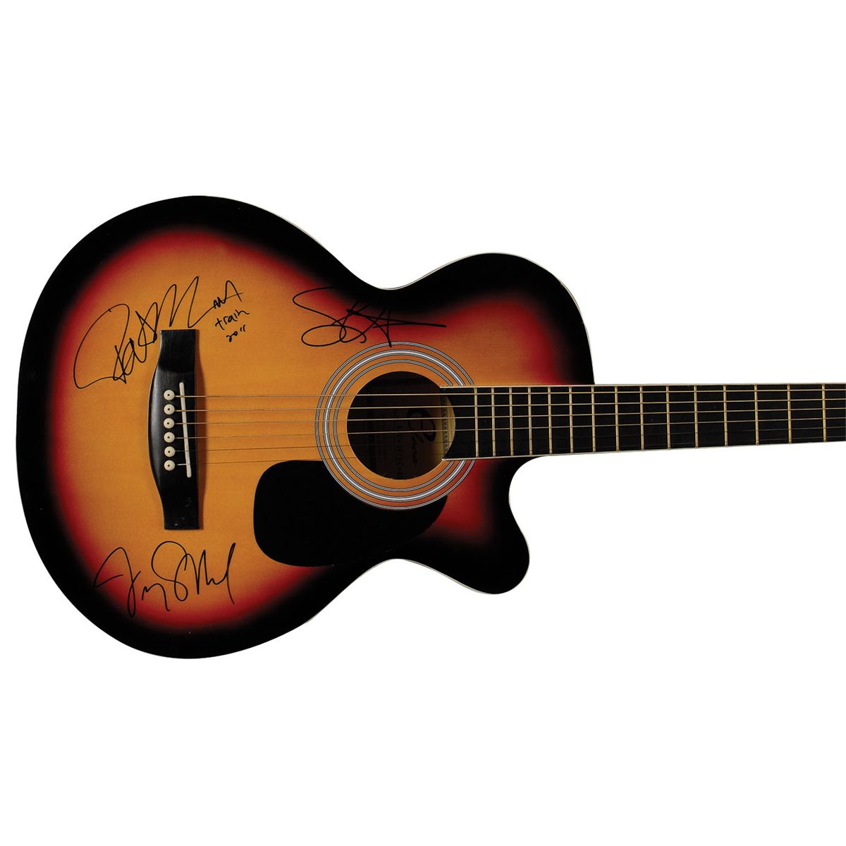 Sunburst-finish Cleca six-string acoustic guitar, signed on the body in black felt tip by Patrick Monahan, Scott Underwood, and Jimmy Stafford. In fine condition. Oversized.