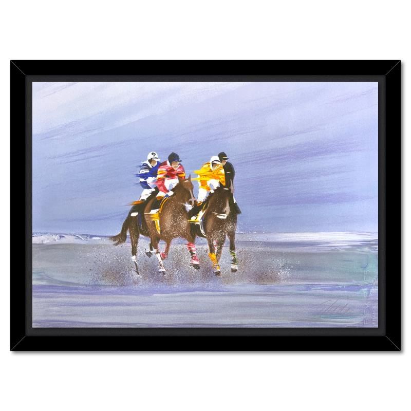 "Training on the beach" is a limited edition lithograph on paper by Victor Spahn. Printed at Art-Lithographies workshop in Paris, the piece is hand signed by the artist and comes with a certificate of authenticity. This piece is custom framed. Measures approximately 25" x 31.5" (frame), 17" x 23.5" (image).