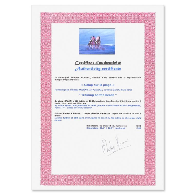 "Training on the beach" is a limited edition lithograph on paper by Victor Spahn. Printed at Art-Lithographies workshop in Paris, the piece is hand signed by the artist and comes with a certificate of authenticity. Measures approximately 17" x 23.5" (image).
