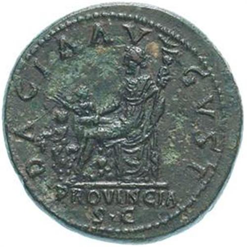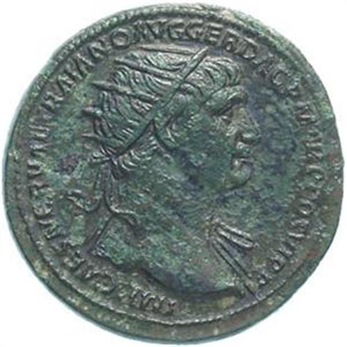 Roman Empire Coins. Trajan (98-117). Dupondio. D/ IMP CAES NERVAE Trajan AVG GER DAC PM TR P COS VI PP. Busto radiato e drappeggiato a destra. R/ DACIA AVGVST PROVINCIA SC. La Dacia, seduta a sinistra, tiene aquila legionaria. Davanti a lei, due bambini tengono uva e grano. RIC 623a. gr. 13.99 R. AE. qSPL. Patina verde.