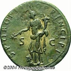 <B>Trajan.</B></I> A.D. 98-117. AE sestertius (32 mm, 22.42 g). Rome, A.D. 103-111. Laureate bust right, slight drapery on far shoulder / Pax standing left, holding branch and cornucopiae; right foot placed on Dacian. RIC 503; BMC 800; Cohen 406. Good VF, green patina with attractive earthen tones, a few scattered spots of corrosion. <BR><BR><B>Important notice:</B> Heritage usually auctions material at the rate of 200-250 lots per hour. On some occasions eBay Live bid software or the Internet may not be able to keep up with the pace of the auction. We recommend placing a realistic absentee bid now as insurance to avoid disappointment. Occasionally the auctioneer may eliminate or reject an eBay Live bid, and the auctioneer may also reopen a lot after the close of the eBay live bidding (usually because we missed an audience bid), and may reject your bid even if it shows you as the winning bidder. By bidding via eBay Live, you agree that Heritage may award the lot to another bidder at its sole discretion under the circumstances described above or any other reasonable circumstances. Since eBay bids are not shown to us until we open the lot on the floor, we treat those bids just like floor bids. In most cases the floor responds before the eBay bid is presented to us, due to Internet lag time, so for consistency we have made it a policy that floor bids are always considered first over tie eBay live bids. Also please note that all Heritage lots purchased through eBay Live carry a 20% Buyer's Premium. Please make sure you read the Terms and Conditions before you bid.