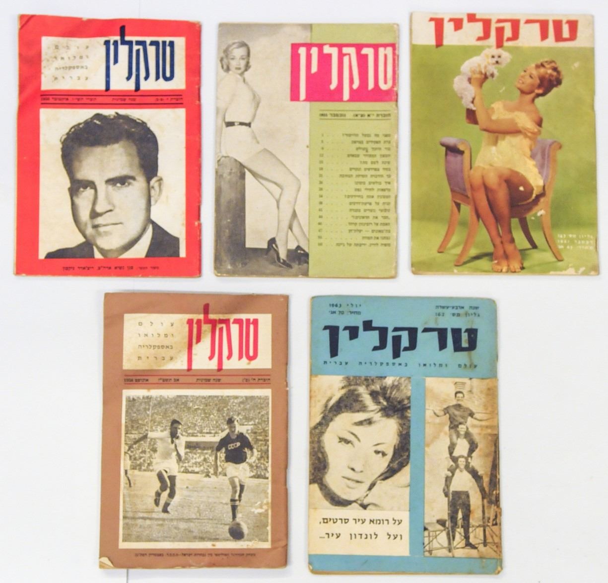 Traklin - The World through the Hebrew Mirror - collection of 5 monthlies, 1955-1963. These contain articles on a variety of issues concerning Israeli life and some photos. Overall in good conditions: reasonably worn, yellowing pages, some stains mostly on bindings.