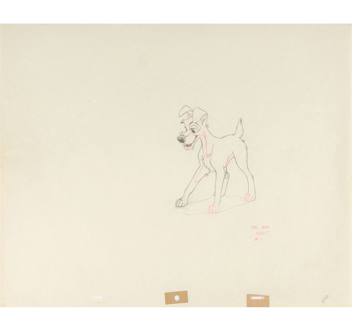 (Walt Disney Studios, 1955) Original matching set of production drawings featuring the Tramp and Jock the Scotty Dog from Lady and the Tramp, which could be arranged to appear as if they were talking to each other. Accomplished in graphite and colored pencil on two sheets of untrimmed 15.5 x 12.5 animation paper. Images measure 4 x 3 and 3.5 x 5. In fine condition.