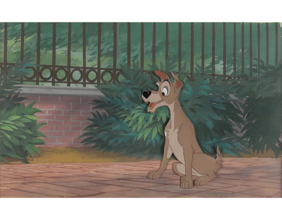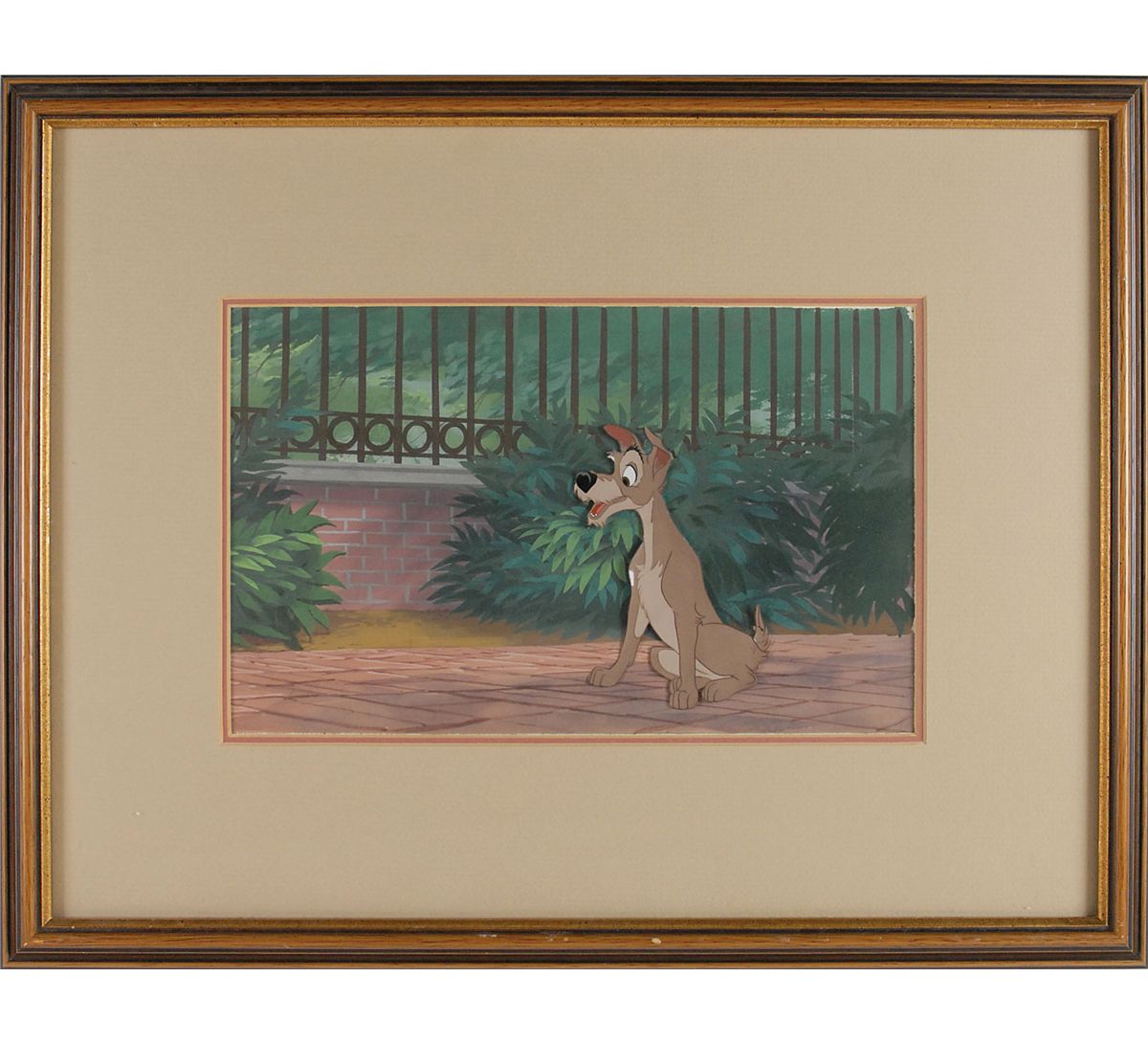 (Walt Disney Studios, 1955) Original production cel and production background featuring Tramp from Lady and the Tramp. The cel has been trimmed and applied to a hand-painted production background from the same film. Tramp measures 3 x 4.75. This piece is also double-matted and framed to an overall size of 18.5 x 14.5. In fine condition. An attractive item which nicely incorporates the vibrant production background with the cel of the film’s hero.