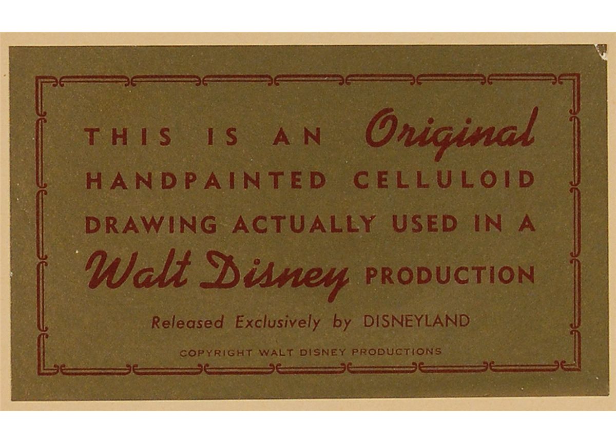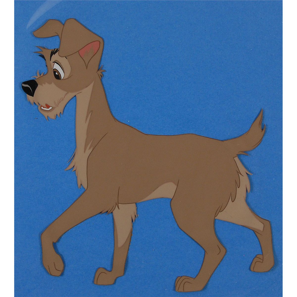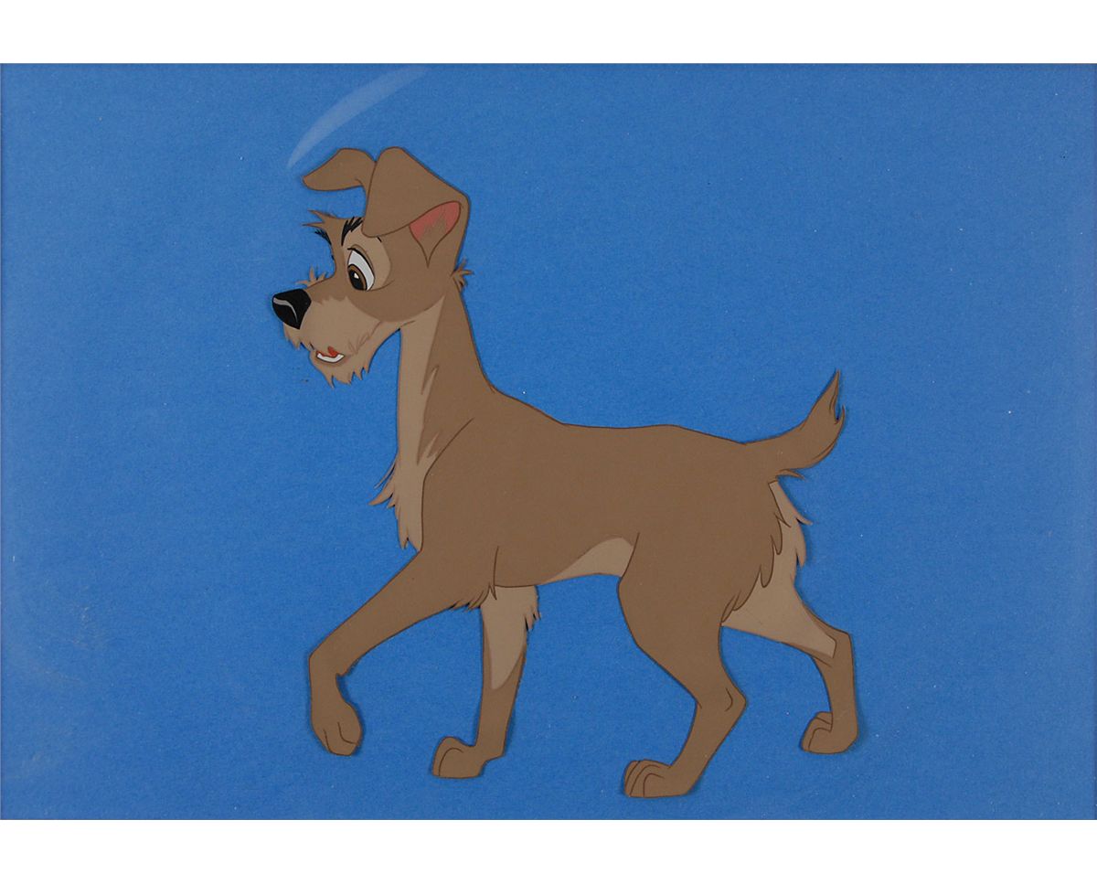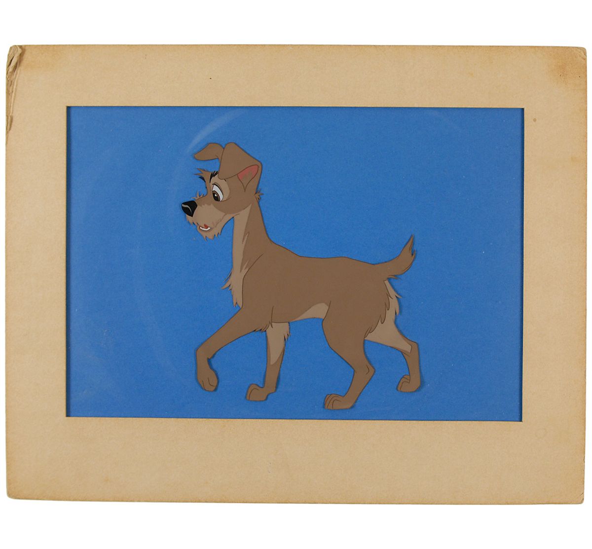 (Walt Disney Studios, 1955) Original production cel featuring Tramp from Lady and the Tramp. Image measures 5.5 x 6.25, with a mat opening of 11 x 7.5. Mat dimensions are 14 x 11. Reverse of the backing bears a gold label stating that it is an original hand-painted celluloid actually used in a Walt Disney production, and was released exclusively through Disneyland. In fine condition, with creasing to the left edge of the mat.