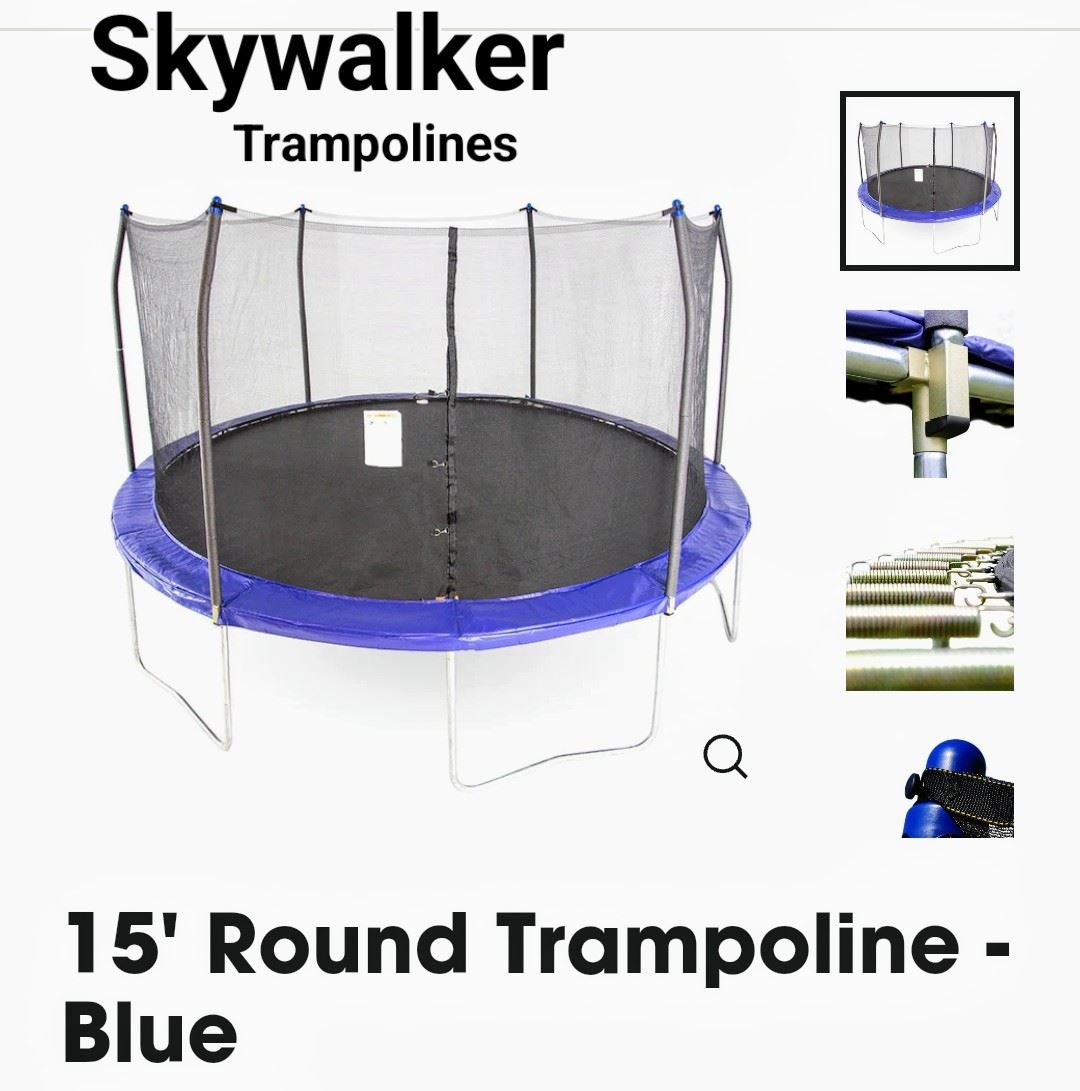 15-foot round outdoor trampoline with safety net, sturdy frame construction, blue padding, new.