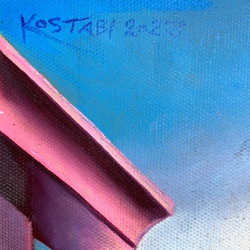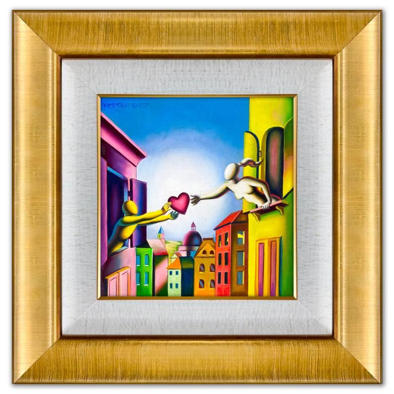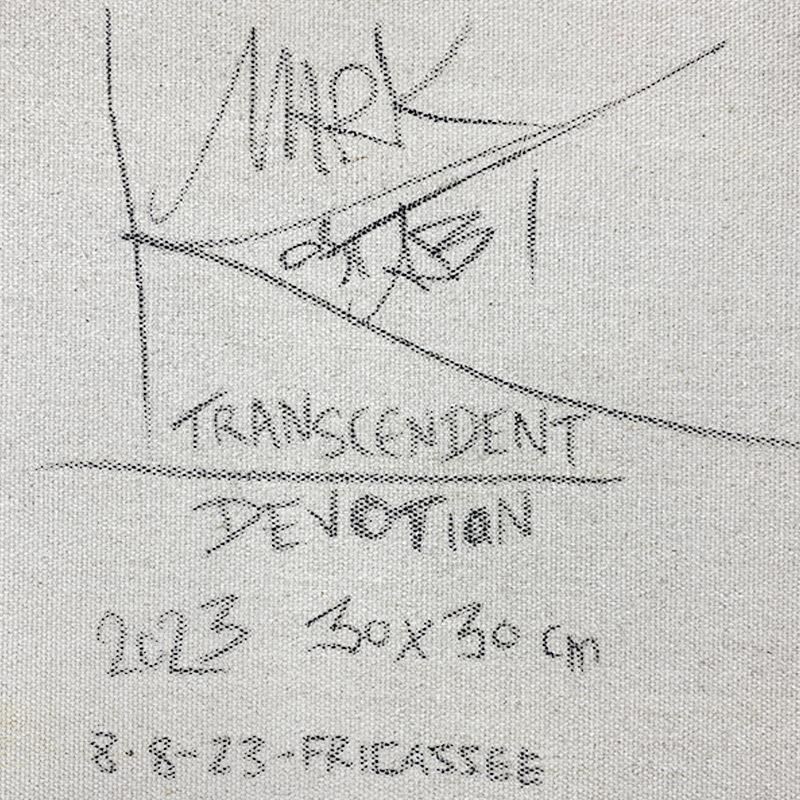 "Trancendent Devotion" is an original oil painting on canvas by Mark Kostabi, hand signed by the artist. This piece comes custom framed. Includes Certificate of Authenticity. Measures approx. 22" x 22" (frame), 12" x 12" (image).
