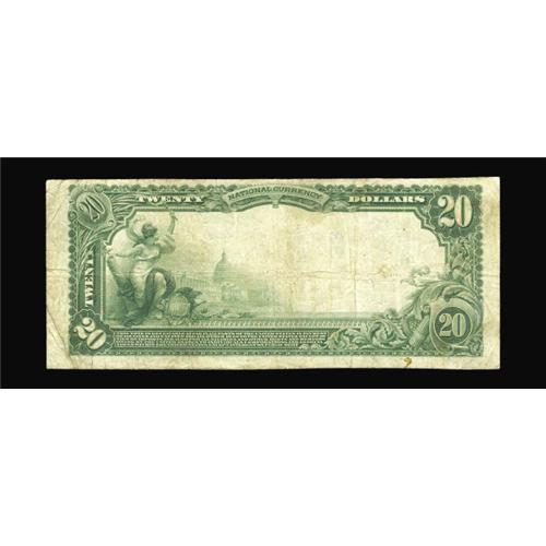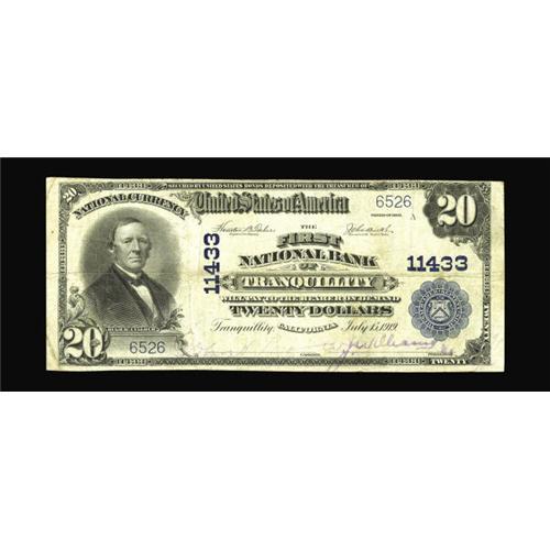 <B>Tranquility, CA</B></I> - $20 1902 Plain Back Fr. 658 <B>The First NB</B></I> Ch. # 11433<BR>Since 1990 only two notes from this one bank town in Fresno County have been offered. Both those notes were offered by John Hickman and both were what he often referred to as "Zombies"; notes so badly damaged or ugly that they are nearly lifeless. For the first time since the zombies were discovered, a presentable and most collectible note is available to the collecting community. Don't let an opportunity to own a note from a bank that was missing from even the finest collections of California Nationals pass by here. Wholly original <B>Fine+</B></I> with pleasantly bold color and clear signatures.