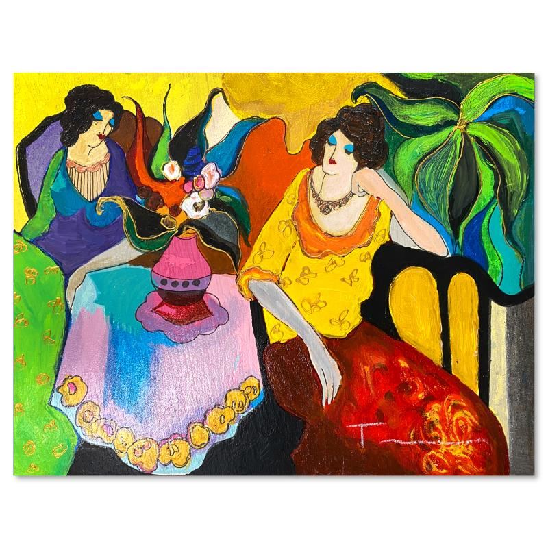"Tranquility" is a one-of-a-kind mixed media over paint on wood by Itzchak Tarkay (1935-2012), hand signed by the artist. Includes Letter of Authenticity. Measures approx. 9" x 11.5" (image).