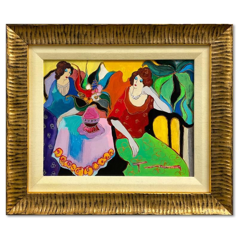 "Tranquility" is a one-of-a-kind mixed media over paint on wood by Itzchak Tarkay (1935-2012), hand signed by the artist. This piece comes custom framed. Includes Letter of Authenticity. Measures approx. 13.5" x 16" (frame), 8.5" x 11" (image).