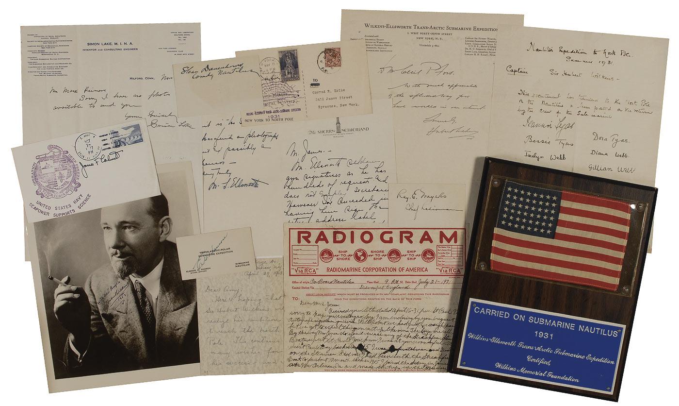 Archive of the 1931 expedition of the submarine Nautilus. In 1931, Australian explorer Sir George Hubert Wilkins and a volunteer crew of submariners and scientists set out in a decommissioned U.S. Navy submarine to sail under water from Spitsbergen to the Bering Straits by way of the North Pole. Wilkins provided much of the financial support for the expedition from his own pocket, supplementing the total by raising funds from private individuals. He received scientific support from such institutions as the Carnegie Institution of Washington, the Woods Hole Oceanographic Institution, the Norwegian Geophysical Institute, the American Geographical Society, and the Cleveland Museum of Natural History, however even this impressive list of supporters did not prevent people from seeing the trip as nothing more then a publicity stunt, which ended in failure 300 miles from the Pole. Included are: a vintage newspaper photo of the Nautilus signed by Simon Lake; a 1931 brief ALS from Simon Lake; signature of Lincoln Ellsworth on a clipped return address; a two page ALS to Robert Jones, signed M. L. Ellsworth; a commemorative cover, carried aboard the Nautilus, and signed by Sir Hubert Wilkins, Sub Commander and Sloan Danenhower, ships Master; a vintage clipped newspaper photo of Nautilus signed by Sloan Danenhower; an ink signature, “Sloan Danenhower, Comdg Nautilus,” on an off-white card; a brief ALS signed by Sir Hubert Wilkins; a handwritten statement by Wilkins reading: “Nautillus Expedition to North Pole, Summer 1931, Captain Sir Hubert Wilkins. This document has traveled to the North Pole in the Nautilus & been posted on the return by the crew of the submarine,” and includes the signatures of Jeannie Tyas, Bessie Tyas, Jacelyn Webb, Dora Tyas, Diana Webb, Gillian Webb, W.M. Colles, J.W. Colles, and Dorothy Colles.; a vintage signed 8 x 10 photo of Wilkins; a signature of the Executive Officer of the Nautilus, I[ssac] Schlossbach as well as a commemorative cover; a handwritten Radiogram from crew member Harry A. Zoeller; signed business card from Elwood H. Hanson, Diving Officer; ink signature “Frank Crilley, Master Diver, Submarine Nautilus, Trans-Polar Expedition;” signature of Ray. E. Meyers, Chief Radioman on an off-white card; ink signature of Arthur O. Bleneburg; a commemorative cover bearing a cachet honoring Operation Deep Freeze, signed by Admiral James F. Calvert; and a rare 4 x 6 inch United States 48 star flag, carried aboard the Nautilus voyage, mounted to an 8 x 10 wooden plaque, with a descriptive plaque affixed below the flag reading: “Carried On Submarine Nautilus, 1931, Wilkins-Ellsworth Trans-Arctic Submarine Expedition, Certified Wilkins Memorial Foundation.” In fine overall condition. RRAuction COA.