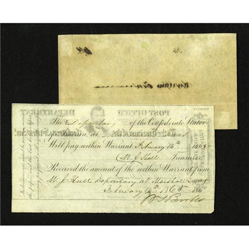 <B>Trans Mississippi Post Office Department Check for $1132.21 and a Certificate of Deposit for Treasury Notes April 2, 1864.</B></I> The Post Office item is from Marshall, Texas and dated February 16, 1865.<BR><BR><BR><b>Shipping:</b> Coins & Currency (<a target="_blank" href="http://www.heritageauctions.com/common/shipping.php">view shipping information</a>)