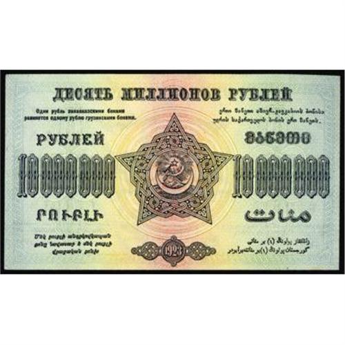<style type="text/css"> body, td, th { font-family: Arial, Helvetica, sans-serif; font-size: 12px; color: #482424; margin: 0px; padding: 0px; } #header { background-image: url(http://www.bowersandmerena.com/ebay/images/template_v3_01.gif); clear: both; background-color: #590303; border-top-width: 2px; border-top-style: solid; border-top-color: #B38C4F; } #header #header_wrapper { height: 75px; clear: both; width: 800px; margin-right: auto; margin-left: auto; background-image: url(http://www.bowersandmerena.com/ebay/images/template_v3_03.gif); background-repeat: no-repeat; background-position: right; color: #F3EDCC; } #header #header_wrapper #header_logo { float: left; height: 75px; width: 444px; background-image: url(http://www.bowersandmerena.com/ebay/images/template_v3_02.gif); background-repeat: no-repeat; font-size: 10px; text-transform: capitalize; color: #B38C4F; } #header #header_wrapper #header_right { float: left; height: 75px; width: 356px; text-align: right; } #header #header_wrapper #header_right #headerLoginBtn { margin-bottom: 30px; } #header #header_wrapper #header_right input#txtSearch { color: #B49056; border: 1px solid #B49056; width: 175px; padding-top: 3px; padding-right: 3px; padding-bottom: 4px; padding-left: 3px; } #nav { height: 37px; background-image: url(http://www.bowersandmerena.com/ebay/images/template_v3_05.gif); clear: both; } #nav #nav_wrapper { height: 35px; width: 800px; margin-right: auto; margin-left: auto; border-left-width: 1px; border-left-style: solid; border-left-color: #B38C4F; } #nav #nav_wrapper a { padding-right: 15px; padding-left: 15px; border-right-width: 1px; border-right-style: solid; border-right-color: #B38C4F; height: 25px; padding-top: 10px; display: block; float: left; text-decoration: none; font-weight: bold; color: #5D0303; } #nav #nav_wrapper a:hover { color: #B38C4F; } #nav #nav_wrapper #search { float: right; padding-top: 7px; } #nav #nav_wrapper #search #txtSearch { font-family: Arial, Helvetica, sans-serif; font-size: 10px; text-transform: uppercase; color: #D2AE75; border: 1px solid #B38C4F; padding: 3px; } #content_bgd { background-image: url(http://www.bowersandmerena.com/ebay/images/template_v3_09.gif); background-repeat: repeat-y; background-position: center; padding-top: 15px; padding-bottom: 15px; background-color: #FBFBDB; } #content_wrapper { clear: both; height: auto; width: 800px; margin-right: auto; margin-left: auto; } .LotDetailWhite { line-height:normal; font-size:13px; font-family: arial,helvetica,sans-serif; color: White; font-weight: bold; } .LotDetailInformation { line-height:normal; font-size: 13px; font-family: arial,helvetica,sans-serif; } .LotDetailMessage { line-height:normal; font-size: 13px; font-family: arial,helvetica,sans-serif; color: red; } } tr.HeaderAuctionTitle td { color: #000000; font-weight: bold; padding: 2px; background-image: url(http://www.bowersandmerena.com/ebay/images/template_v3_05.gif); background-repeat: repeat-x; border-bottom-width: 1px; border-bottom-style: solid; border-bottom-color: #B38C4F; } table.AuctionSummary a, table.AuctionSummary a:link, table.AuctionSummary a:visited { color: #0000FF; text-decoration: none; } } td.tableHeaderLeft { border-left-width: 1px; border-left-style: solid; border-left-color: #B38C4F; } td.tableHeaderRight { border-right-width: 1px; border-right-style: solid; border-right-color: #B38C4F; } td.tableCellMiddle { border-left-width: 1px; border-left-style: solid; border-left-color: #B38C4F; border-right-width: 1px; border-right-style: solid; border-right-color: #B38C4F; padding: 5px; } tr.footer td { border-top-width: 1px; border-top-style: solid; border-top-color: #B38C4F; } </style> </head> <body> <div id="header"> <div id="header_wrapper"> <div id="header_logo"> </div> <div id="header_right"> </div> </div> </div> <div id="nav"> <div id="nav_wrapper"> <a href="http://www.bowersandmerena.com">Our eBayLive Auctions</a> <a href="#PaymentInfo">Payment Information</a> <a href="#ShippingInfo">Shipping Information</a> <a href="#About">About Bowers and Merena</a> </div> </div> <div id="content_bgd"> <div id="content_wrapper"> <table width="100%" border="0" cellpadding="5" cellspacing="0" class="AuctionSummary"> <tbody> <tr class="HeaderAuctionTitle" style="height: 25px;"> <td align="left" class="tableHeaderLeft" > </td> <td align="center" class="tableHeaderRight"> <span style="font-size: large;">Lot #2149. Transcaucasia. Federation of Socialist Soviet Republics of Transcaucasia, 1922-1923 Currency Tokens Issues.</span> </td> </tr> <tr> <td colspan="3" class="tableCellMiddle"> Lot of 21 different notes. 1922-1923 issues. All different color and printing varieties. 1000 Rubles through 10,000,000 Rubles, P-S611 through P-S631. Condition varies between XF to CU. Some minor duplication. Scarce high grade assortment of attractive Georgia related notes.
