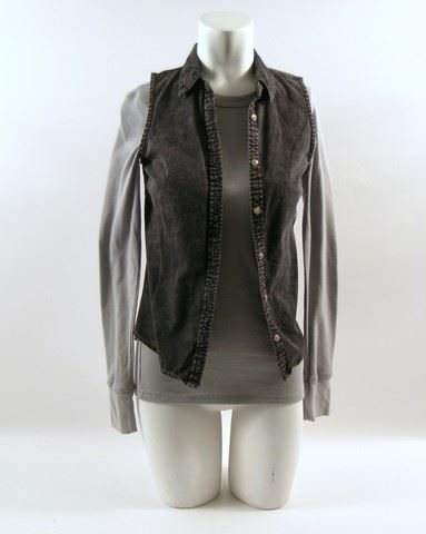 Bree (Kate Mara) screen worn, black button front light cotton 'BDG' vest, (size XS) and light grey long sleeve waffle thermal crew neck 'Alternative' shirt. (size S)