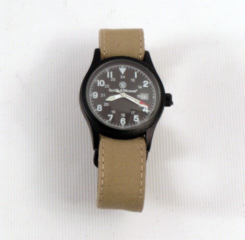 Colonel Stevens (Cole Hauser) screen worn, hero, 'Smith and Weston' black face with tan canvas band wrist watch.