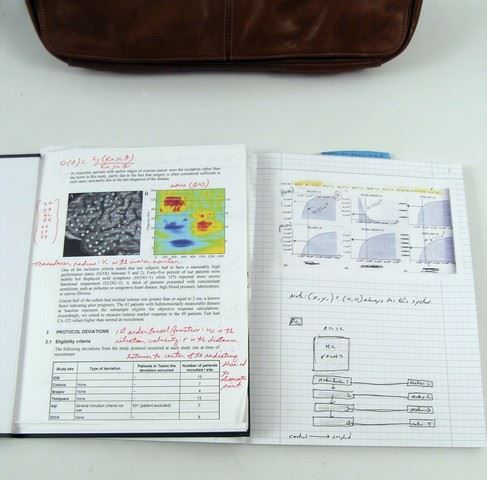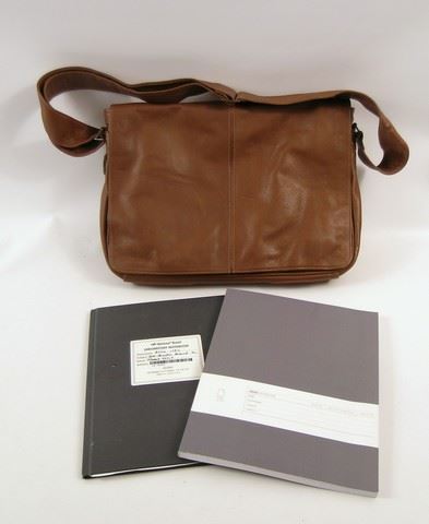 Evelyn Caster (Rebecca Hall) screen used, hero, light brown leather 'Boconi' messenger bag, (approx. 12" x 16") and notebooks with scientific information inside.