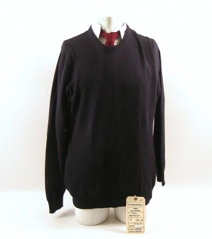 Max Waters (Paul Bettany) screen worn, hero, navy blue long sleeve crew neck 'Brooks Brothers' sweater, burgundy knit 'Charvel' neck tie, and white with blue wide box print long sleeve button front 'Brooks Brothers' shirt. (size 15 1/2 - 36) Includes wardrobe tag!