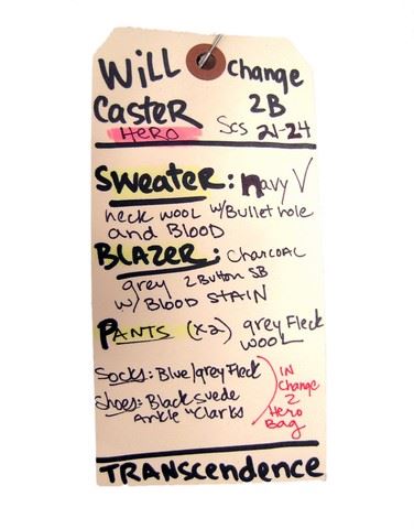 Direct from the production company who produced the fascinating intelligence thriller Transcendence (2014) starring Johnny Depp is Will Caster's (Johnny Depp) screen worn, hero, bloody complete costume. This ensemble includes his charcoal grey two button single breasted notch lapel 'Western Costume Company' custom made jacket, (Western Costume Company label inside with Mr. Depp's name on stitched) bloodied with holes navy blue long sleeve v-neck wool sweater, and grey fleck wool flat front 'Western Costume Company' custom made pants. (Western Costume Company label inside with Mr. Depp's name on stitched) Includes wardrobe tags.