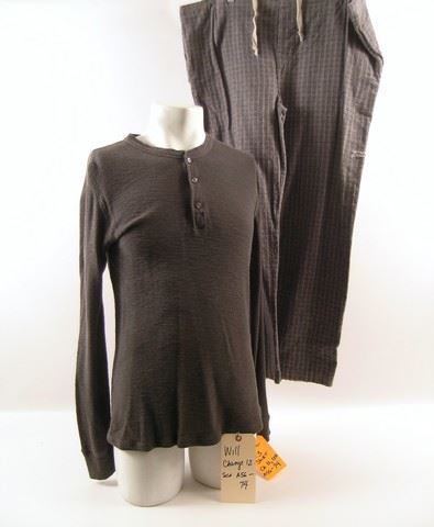 Will Caster (Johnny Depp) screen worn, hero, charcoal grey waffle ribbed cotton long sleeve three button at the neck 'Ralph Lauren' henley shirt, and shades of grey box checker plaid print flannel pajama bottoms. Includes wardrobe tag!