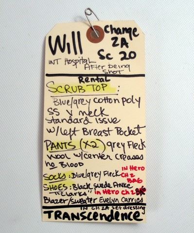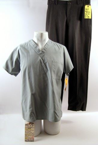 Will Caster (Johnny Depp) screen worn, hero, blue/grey cotton polyester short sleeve v-neck standard issue hospital scrub top, (size M) and grey fleck wool flat front with belt loops with light creases custom made pants. Includes wardrobe tag!