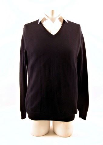 Will Caster (Johnny Depp) screen worn, navy blue long sleeve v-neck 'J. Crew' wool sweater, (size M) and white textured cotton long sleeve with attached collar 'John Varvatos' dress shirt.