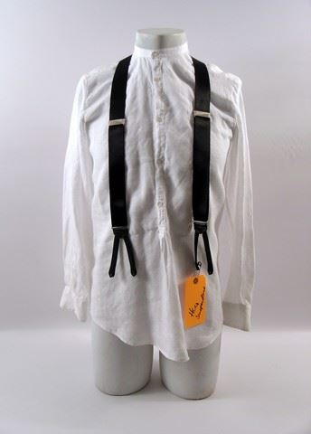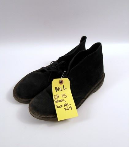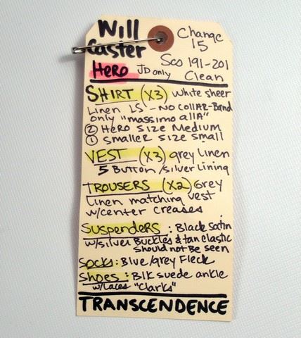Will Caster (Johnny Depp) screen worn, hero, grey linen five button front with silk lining custom made vest, black satin fabric 'Jos A Bank' suspenders, white sheer linen five button down the front custom shirt, grey linen custom made suit pants, (Western Costume Company label inside with Mr. Depp's name on stitched) and black suede ankle with black laces and rubber soles 'Clarks' boots. Includes wardrobe tag!