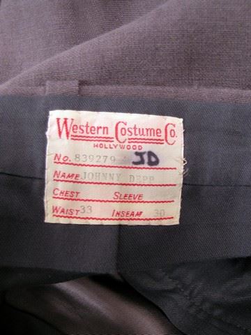Will Caster (Johnny Depp) screen worn, hero, grey linen five button front with silk lining custom made vest, black satin fabric 'Jos A Bank' suspenders, white sheer linen five button down the front custom shirt, grey linen custom made suit pants, (Western Costume Company label inside with Mr. Depp's name on stitched) and black suede ankle with black laces and rubber soles 'Clarks' boots. Includes wardrobe tag!