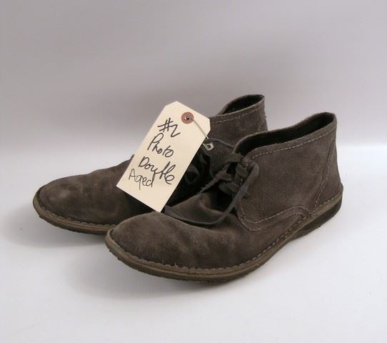 Will Caster (Johnny Depp) screen worn, black knit with shawl collar button front cardigan sweater, white long sleeve button front 'John Varvatos' dress shirt, white cotton aged and worn short sleeve v-neck 'Banana Republic' t-shirt, (size M) and double's grey ankle suede lace up with stitching 'John Varvatos' shoes.